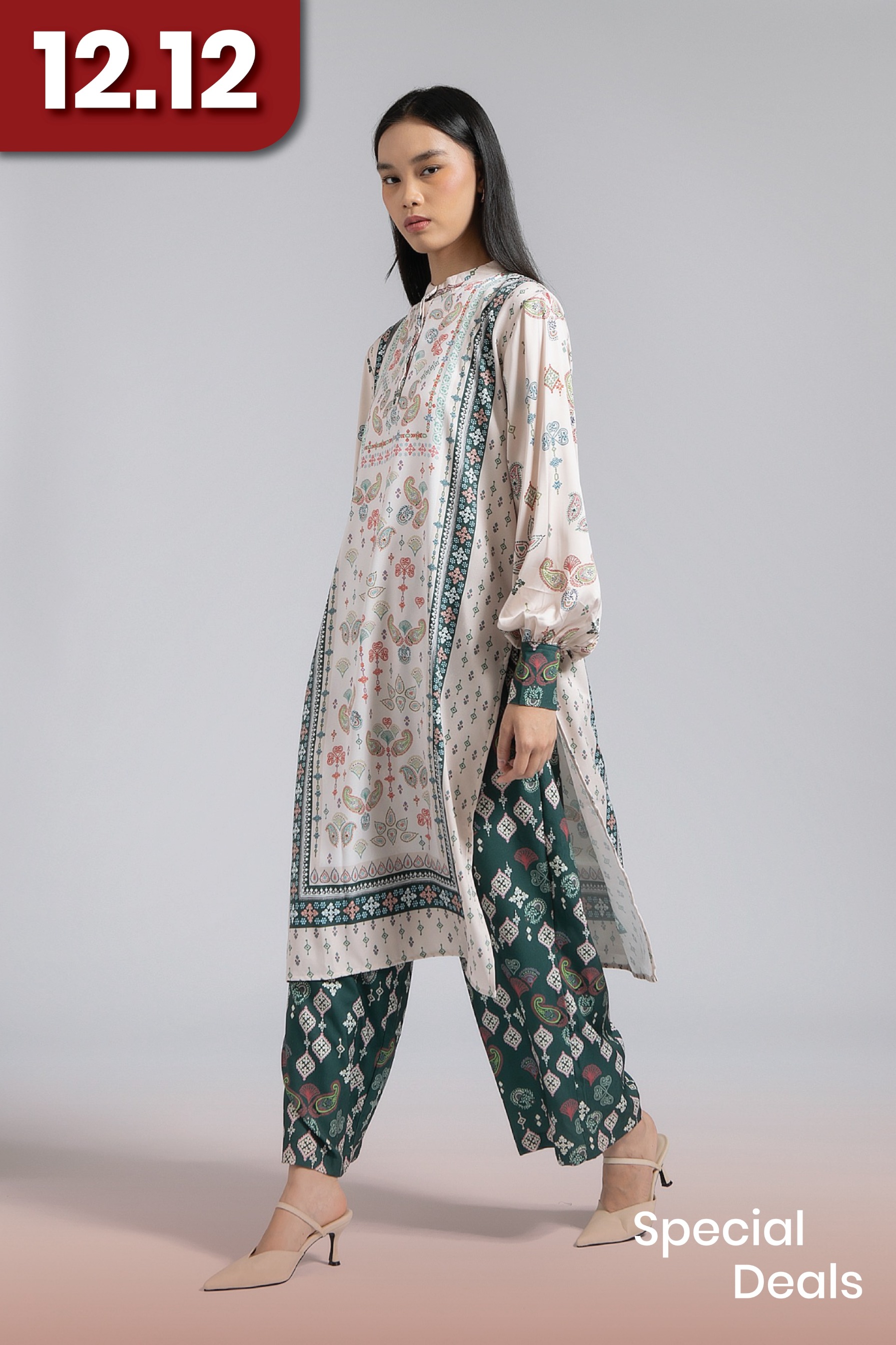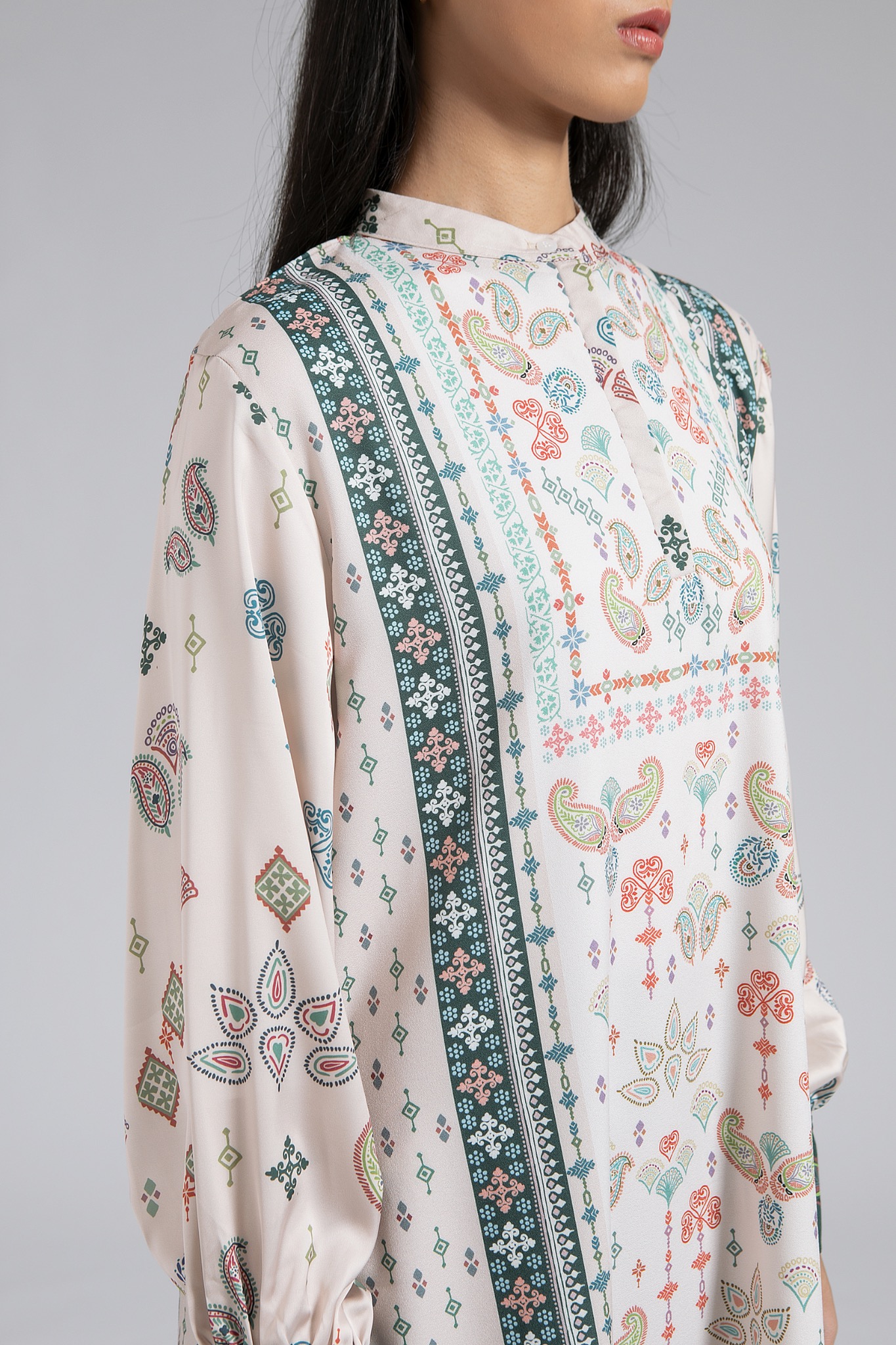 Sekar Set of Long Tunic and Pants with modern ethnic print. Breastfeeding-friendly with front button opening.