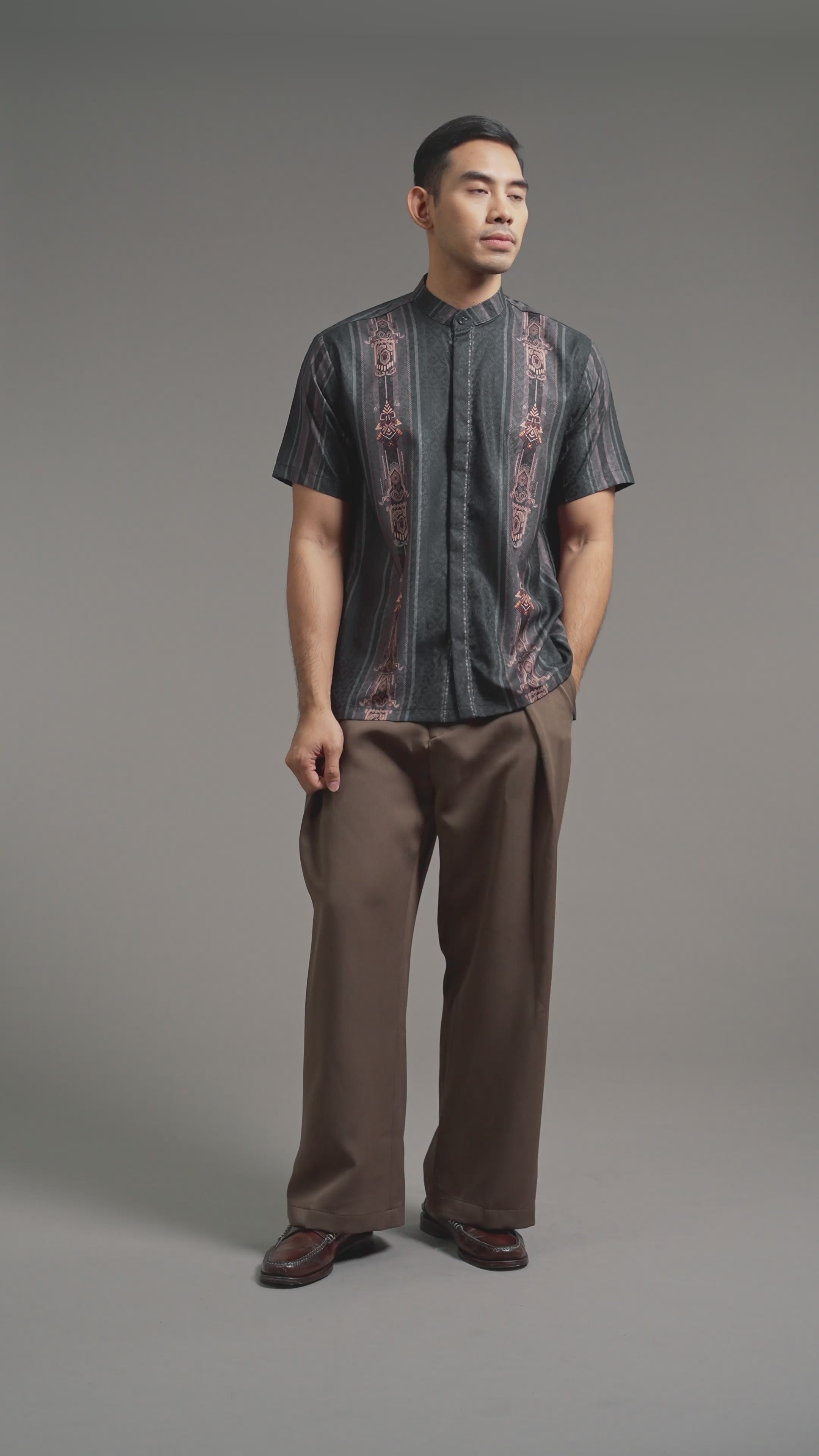 "Elevate your style with the timeless charm of a uniquely patterned short-sleeved shirt. This versatile dobby textured shirt with a mandarin collar is comfortable to wear.