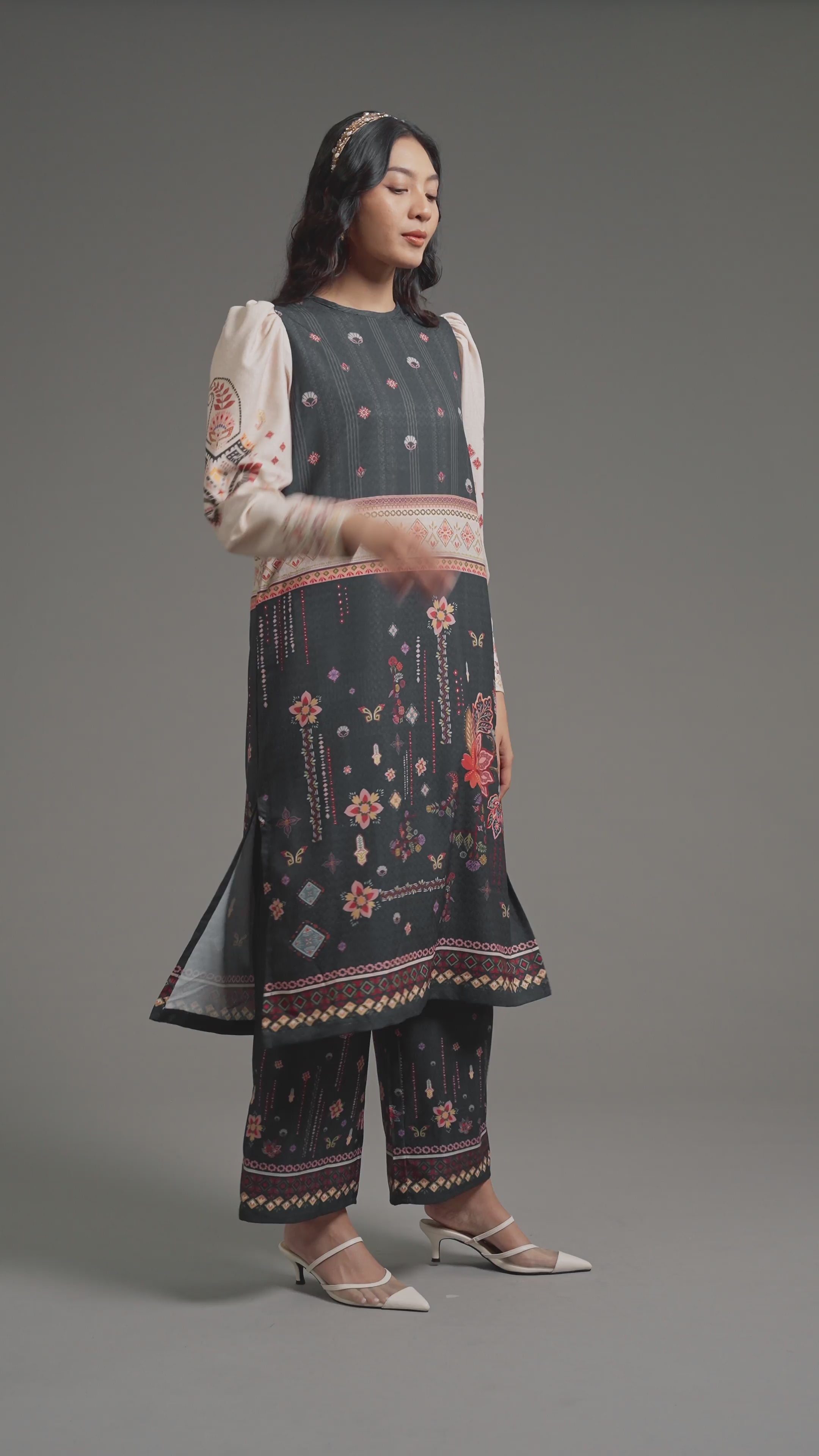 Make a statement in this charming tunic set with pants with our signature pattern. Geni Set tunic with features puffy sleeves and high cuffs, and pants with zipper on the front, and an elastic waist.