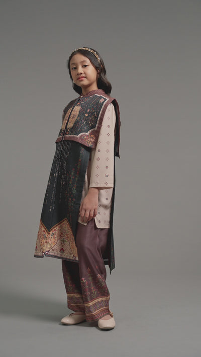 Pijar Set Kids a beautiful tunic and pants, that combine traditional elegance with modern design. The front layered vest and exclusive gold button add a unique touch, while the structured straight silhouette flatters the body shape and ensures comfort for all-day wear.