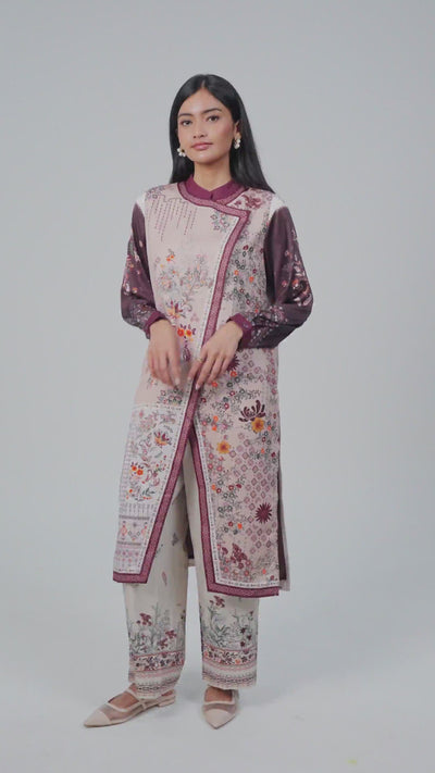 Featuring a harmonious blend of paisley, floral, and geometric prints in a soft nude/blush base color palette. This combination of prints is beautifully spread across the body and sleeves, creating a wearable work of art.