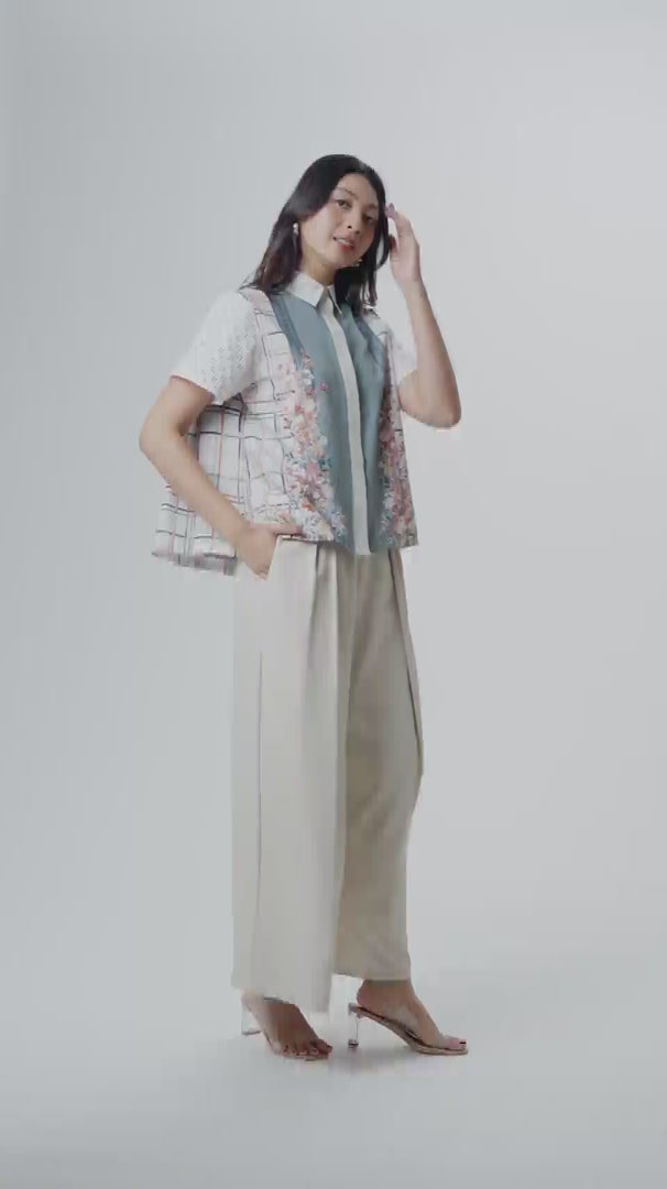 A shirt inspired by the beauty of florals and plaid. This simple shirt features hidden buttons for a sleek look and nursing comfort. A pleated back detail adds elegance, while the combination of premium cotton fabric details that blend into the body, cotton embroidery on the sleeves, and soft textured organza on the back pleats makes this shirt a stunning complement, perfect for pairing with Aella Pants.