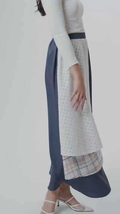 Elegant and fluid, this layered skirt features elastic at the sides, a side zipper, and a hook, creating a sophisticated look. The asymmetrical, wrap-around silhouette flatters the body while maintaining an effortless flow. Crafted from an elegant blend of premium textured poly, soft-textured organza, and embroidered cotton, this skirt offers comfort and elegance—ideal for pairing with sleek tops or structured pieces for a balanced, modern look.