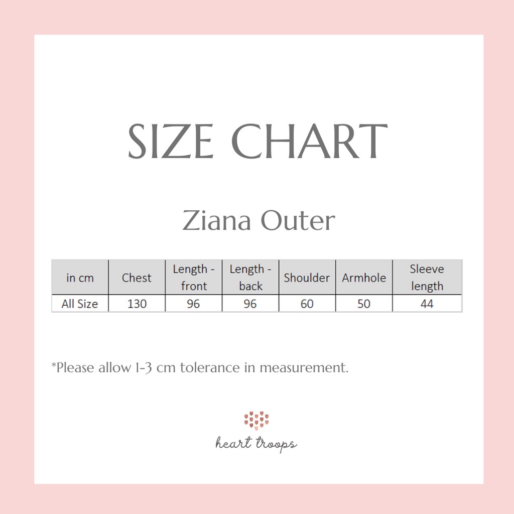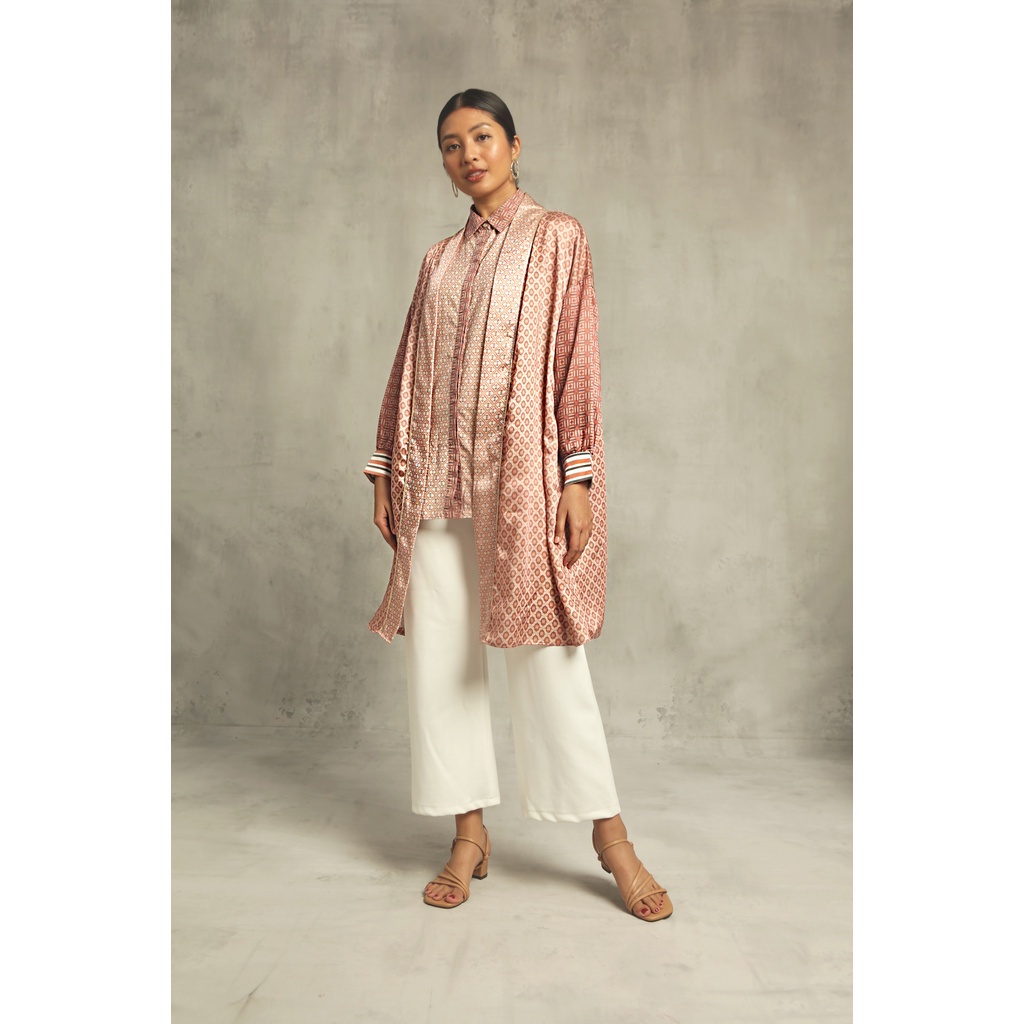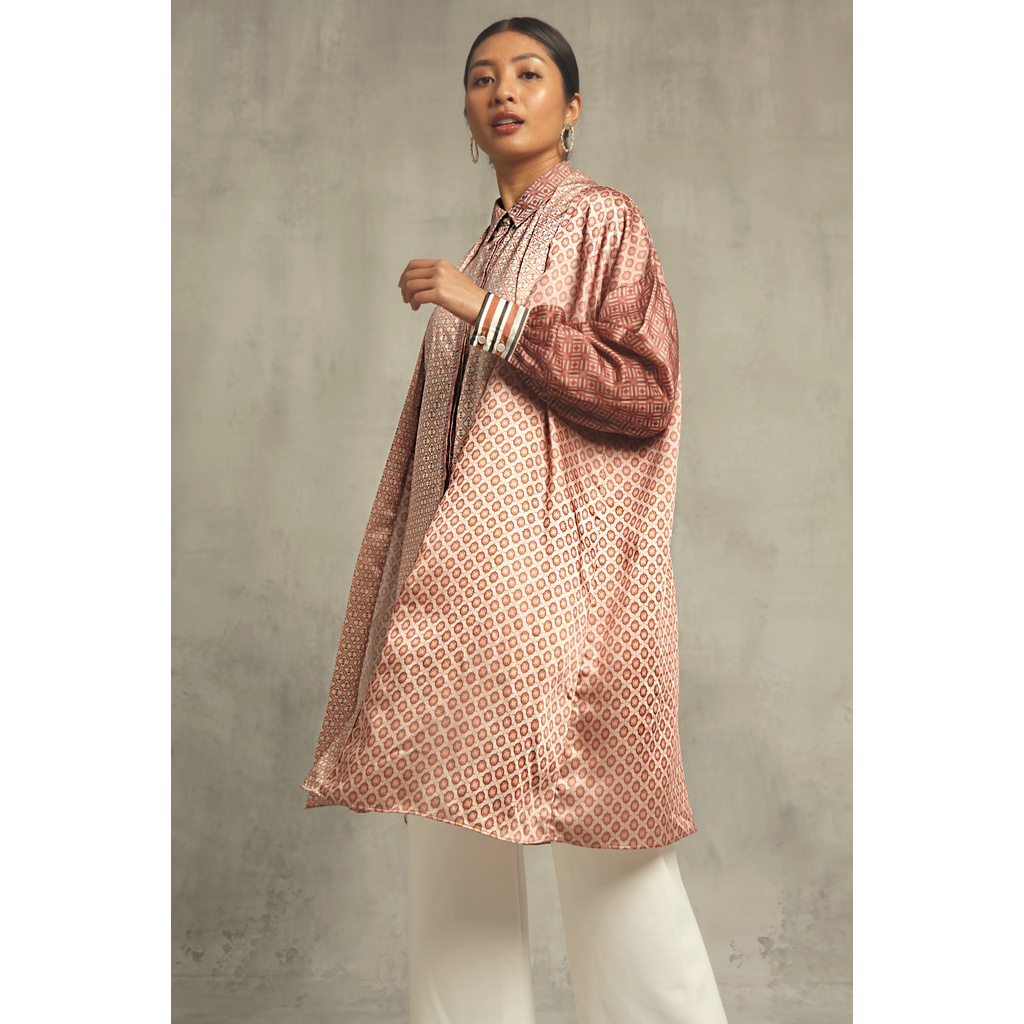 Outer with interesting mix of prints, and luxurious details. Easy way to uplift your look! Material: Premium matte satin. All Size. Bust: 130 Front Length: 96 Back Length: 96 Shoulder: 60 Armhole: 50 Sleeve Length: 44