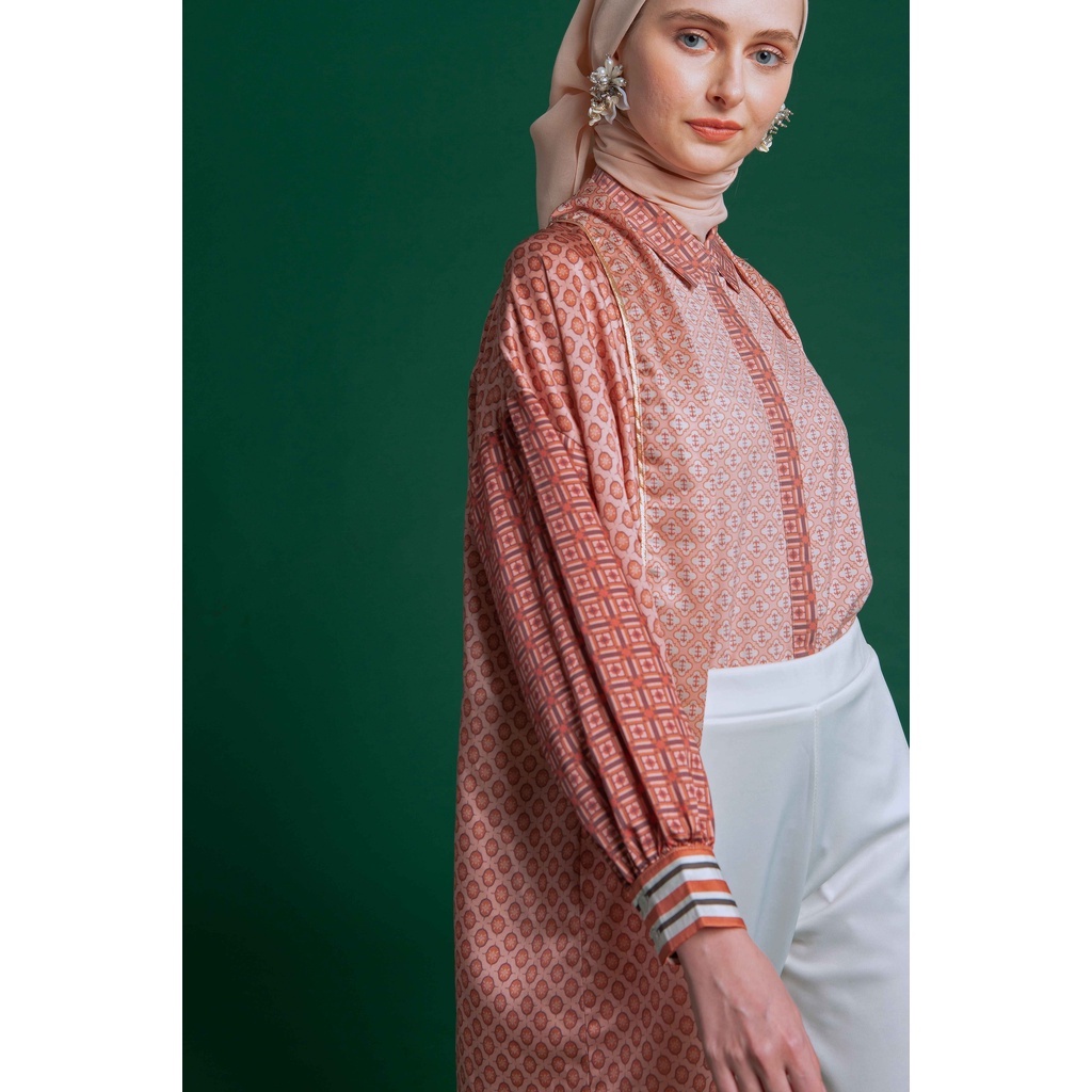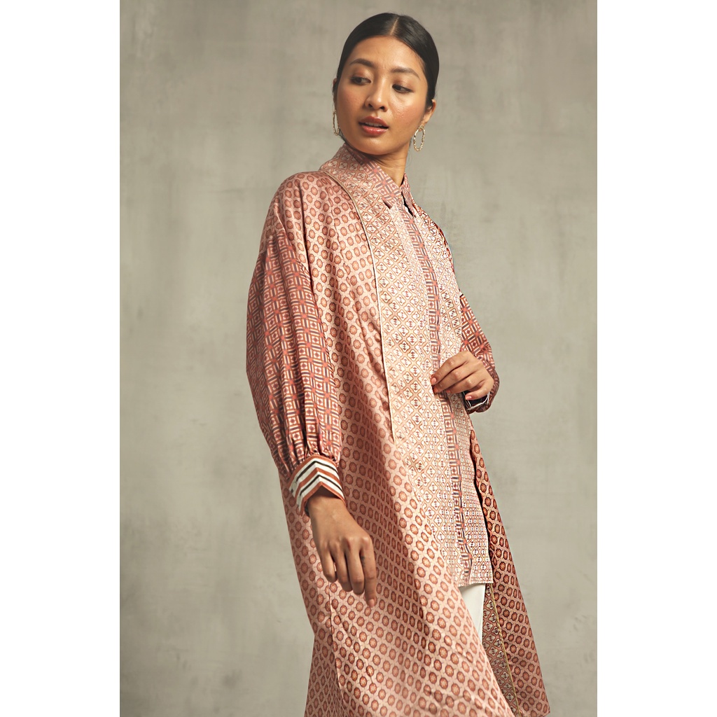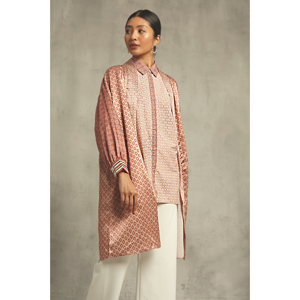 Outer with interesting mix of prints, and luxurious details. Easy way to uplift your look! Material: Premium matte satin. All Size. Bust: 130 Front Length: 96 Back Length: 96 Shoulder: 60 Armhole: 50 Sleeve Length: 44