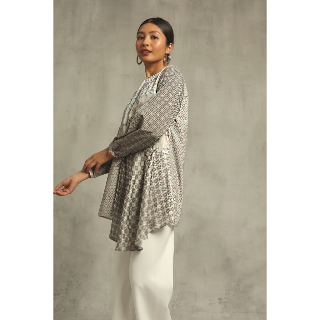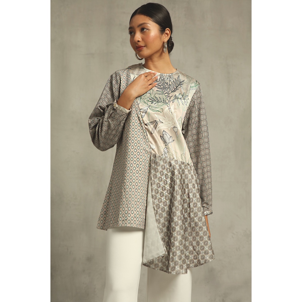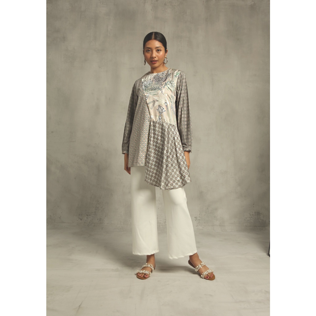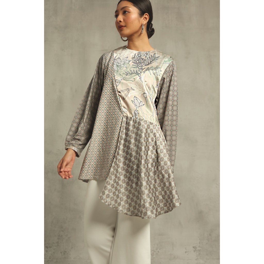 Asymmetrical top with mix print. With hidden front zipper, it is breastfeeding friendly!