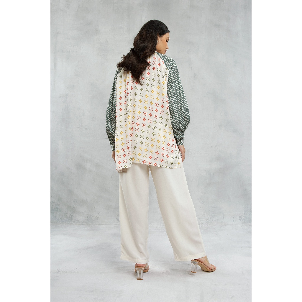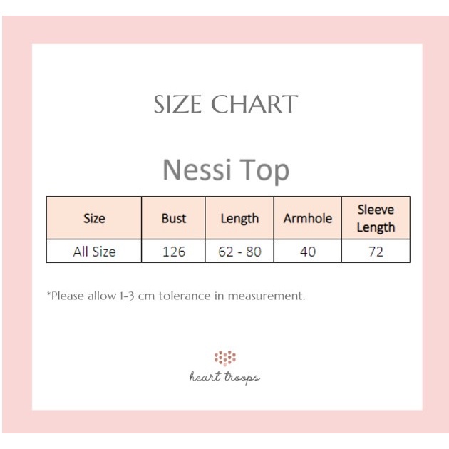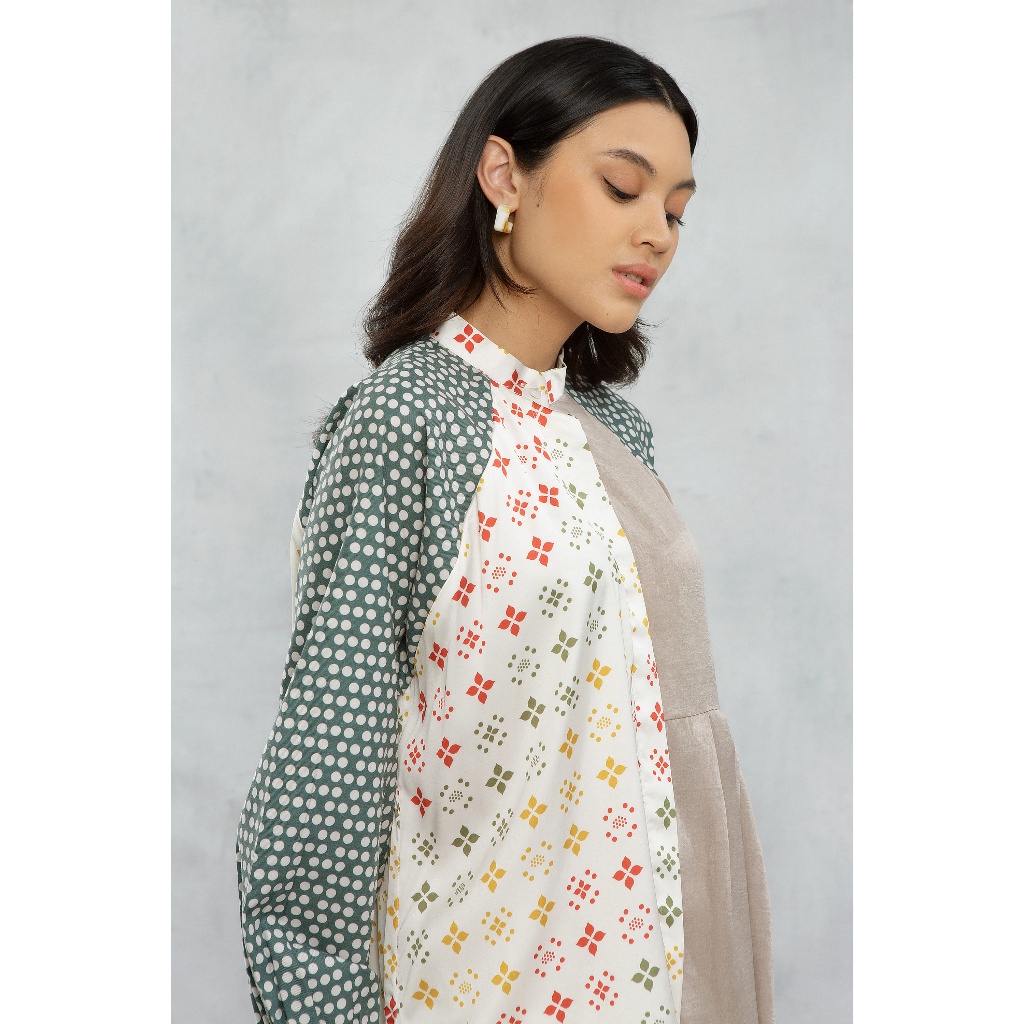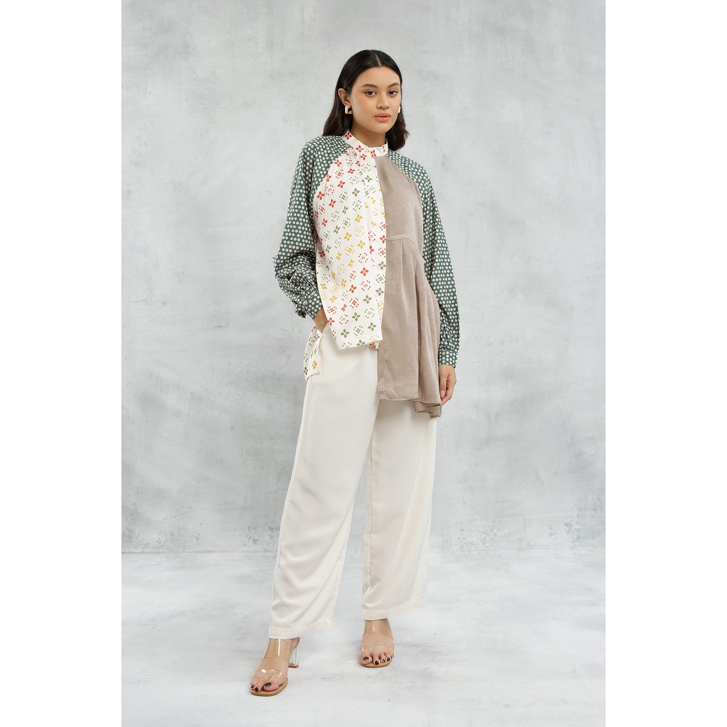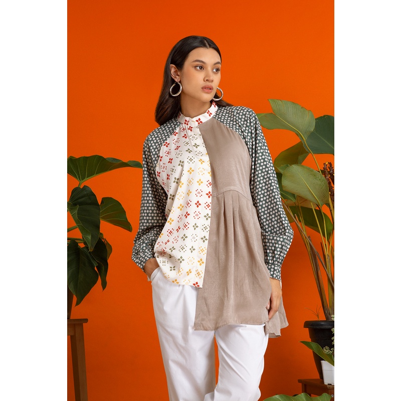 “Nessi” Top Feminine shirt with mix of prints and unique fabrics. It is definitely a piece that you can wear perfectly for regular basis. Front bottom opening Material: Premium cotton blend and satin. Available in one size Size Chart (in cm) : Bust (LD) : 126 Length (Panjang Baju) : 62-80 Armhole (Lingkar Ketiak) : 40 Sleeve Length (Panjang Tangan) : 72 *Mohon sertakan video unboxing dan foto invoice label pengiriman sebagai bukti komplain. Apabila tidak ada bukti, maka komplain tidak dapat diproses.