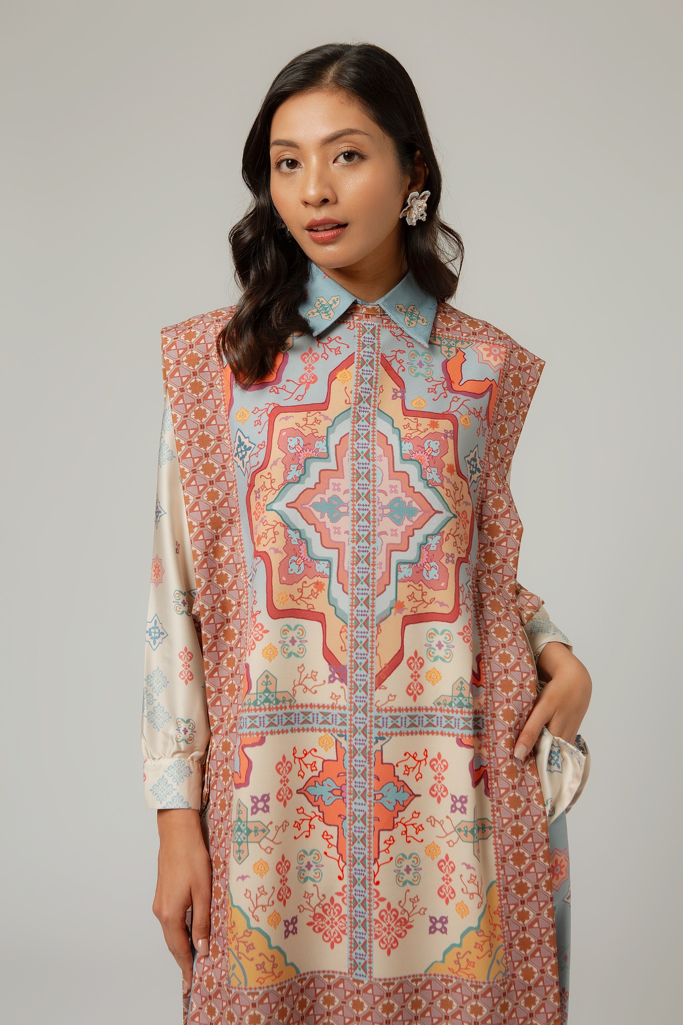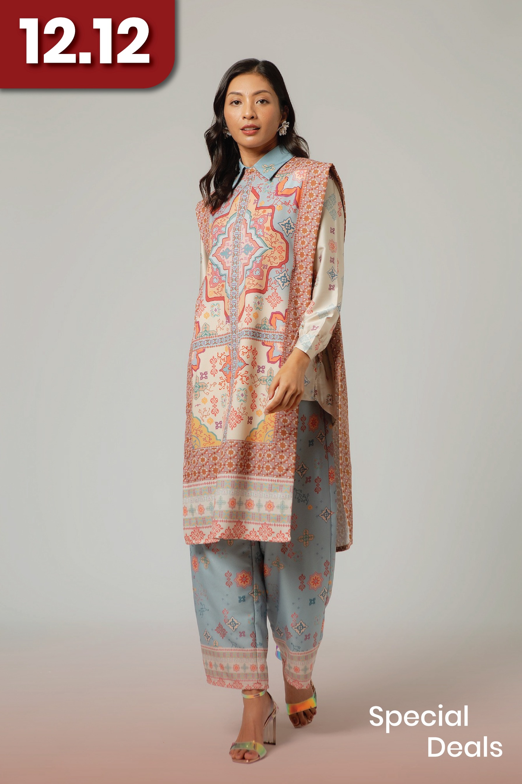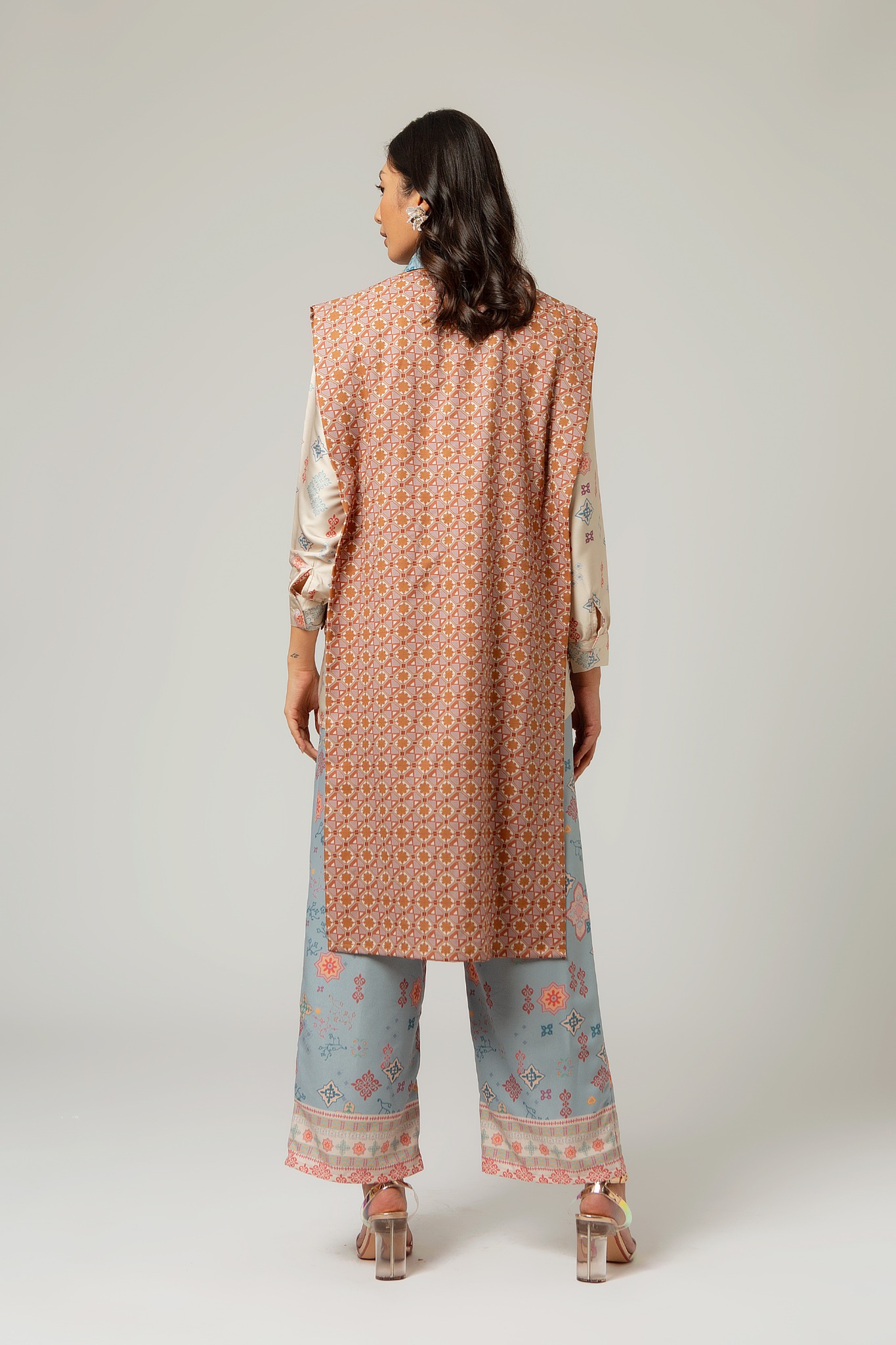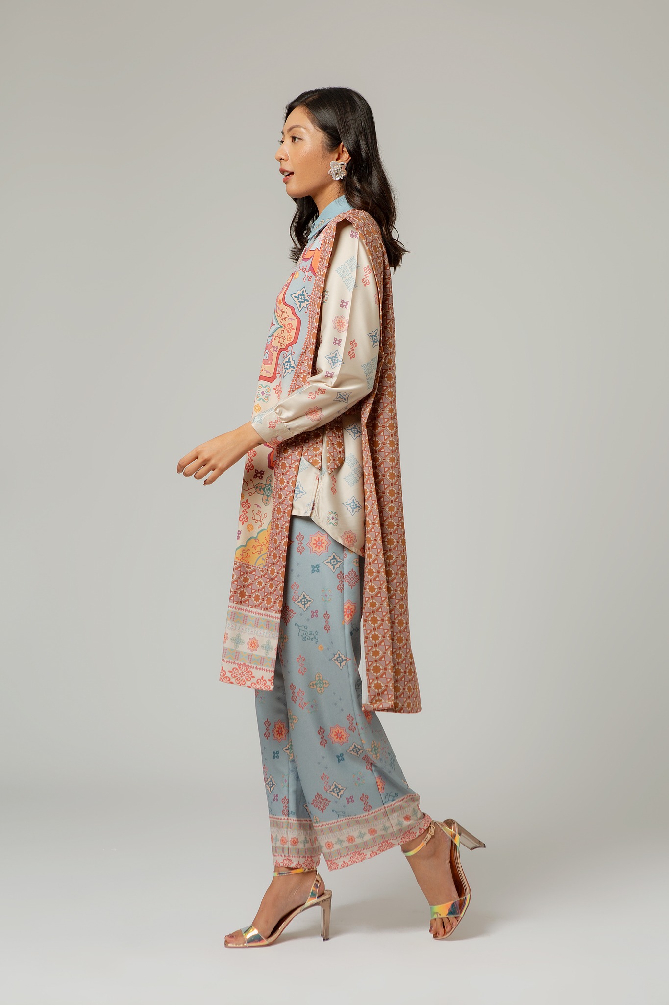Featuring side-tied long vest, front button opening shirt, and elastic waist pants with zipper opening.