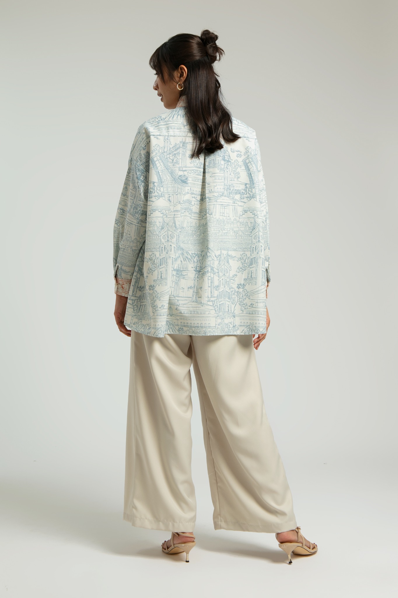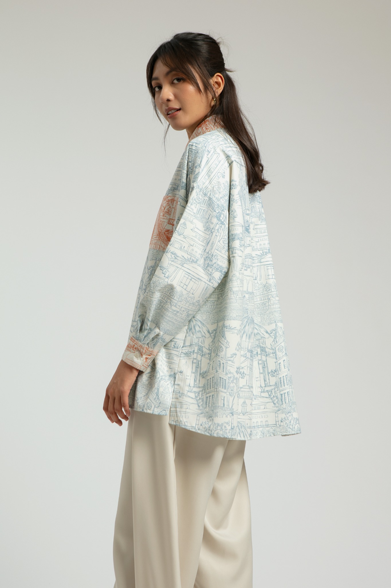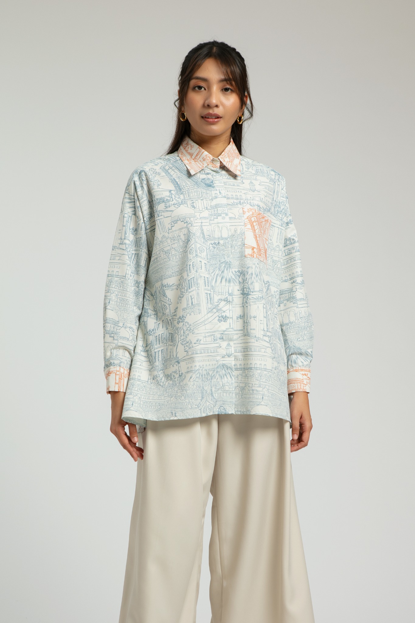 A two-toned monochromatic illustration printed shirt with basic shirt cutting and pocket on the left side. Semeru has harmonious detail prints all over the fabrics to highlight a different tone between main body, pocket, and collar. Breastfeeding friendly.
